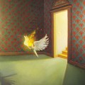 The Pilot Light by Tim Larsen, copyright 2009, oil on canvas, 24 x 18 inches: A basement room in the dark, with a cascading light issuing from the stairs, contains a flying flaming torch. A genre of painting that presents… Read More ›