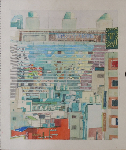 “This is my third painting of this view, slightly unfinished. While I began the first view, construction workers covered the wall of the big Station building with tarps and completely renovated the wall, changing the outer facing with mirrorglass. I just had to paint the contrast of the geometric rooftop structures and the distorted psychedelic reflections on the glass. Glass is actually classified as a liquid.”