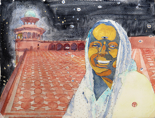 “It took us all day to get to the Taj from our hotel which wasn’t that far away. Touts and Wallahs, pedicabs and a ride in a camel cart, we finally sat in the South Plaza at twilight. And Corinne lit up like a chandelier. ” — Erik Kaye .