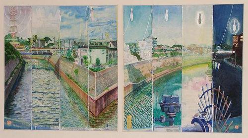 .Editor’s Note: This beautiful watercolor diptych by Erik Kaye shows a water canal scene of what might otherwise be ancient Japan (excluding the outboard motor!) at different times of day highlighting the surrealistic migrating bowling pin gradually emanating from the radio tower on the left and materializing as it arcs across the sky onto the top of the lighted sign on the building on the right… I think I can almost see Erik grinning! Please let me know if you want to get in touch with Erik concerning possible showings or sales here in the States through comments below or at info@beagarth.com.