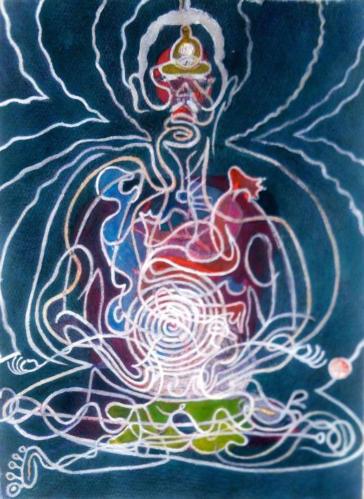 A man meditates; his aura radiates out of the darkness as if it were anatomically determined. Inside his transparent body, two people, his parents, battle, the defining struggle of his life. We see another figure meditating in his lower body, transforming his naval region into a coil of light that sends out the magnetizing intention to transcend his base conflicts.